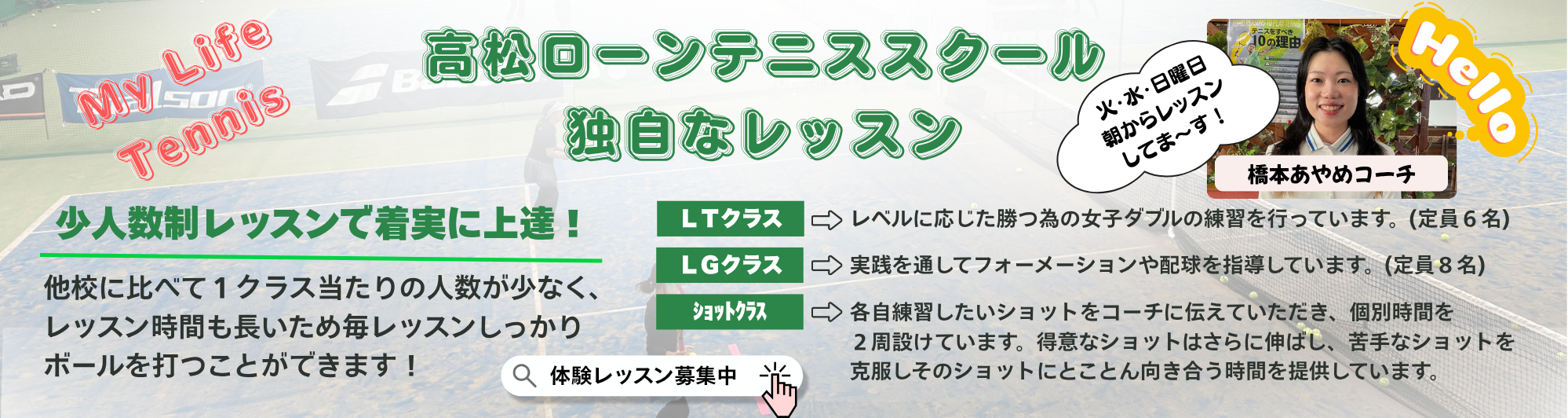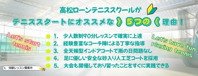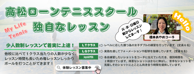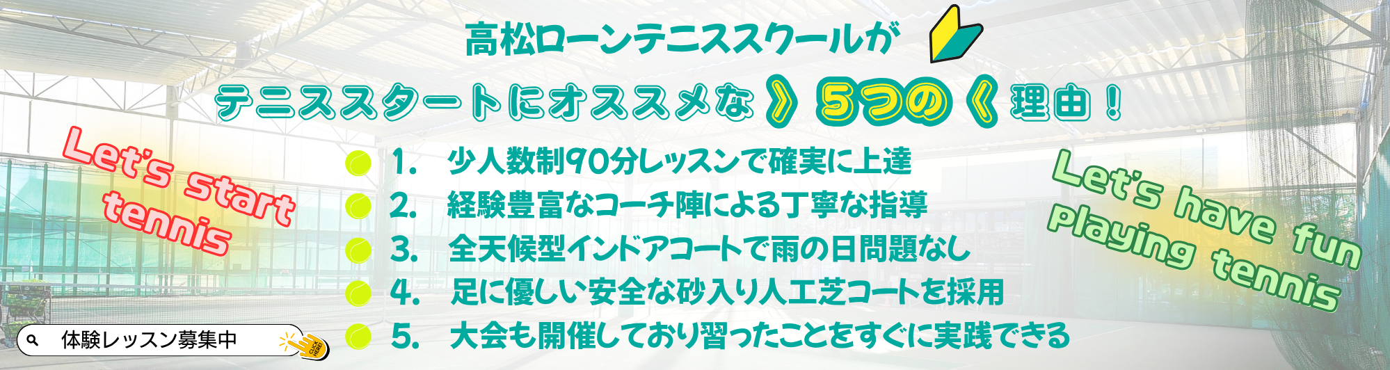 高松ローンテニススクールは年間4学期制を導入して、レベル別に毎週統一性を持ちながらも個々に合った内容でレッスンを進めております。ボールを打つ回数の多さや運動量も重視し、明るく楽しく上達出来るレッスンを行っております。快適なスクールライフをみなさまに末永く送っていただけるよう、コーチ&スタッフ一同、精一杯サポートいたします。 まずは高松ローンテニスクラブへ足をお運び頂き、体験レッスンを是非ご受講下さい。心よりお待ちしております。